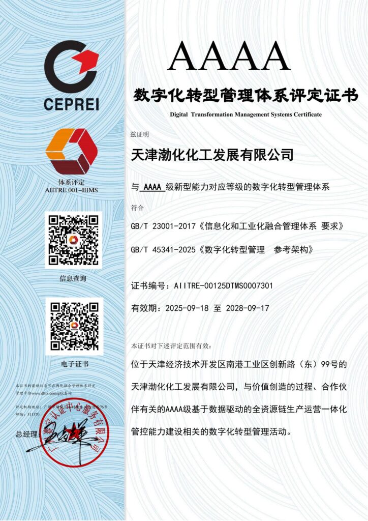 渤化发展获评数字化转型管理体系(两化融合管理体系)4A级企业,标志着公司体系性构建覆盖数字化转型全局的数字治理体系初见成效,在数字化领导力、数字化治理、数字化组织、数字化管理、数字化文化等维度获得第三方认可。未来,渤化发展将全面贯彻企业高质量发展战略,以两化融合5A级标准为目标,持续优化和深化智能工厂建设,以数字化、智能化赋能企业高质量发展。
