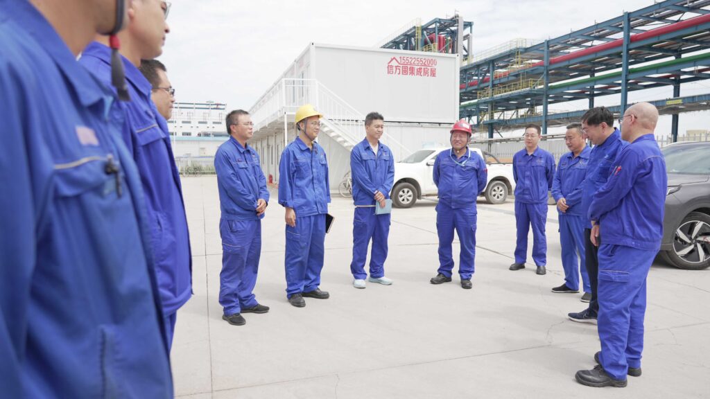 一行人来到二期项目临时指挥部,田云生代表渤化集团领导班子,向高温天气坚守一线岗位的二期项目部职工致以崇高的敬意和诚挚的问候并与二期项目部职工进行亲切交流。他深入了解职工们的日常工作情况,叮嘱大家要注意高温期间防暑降温、劳逸结合,合理安排作业时间,时刻关注自己的身心健康。他强调,要向广大职工普及高温防护知识,深入开展劳动保护宣传教育工作,通过常态化培训增强职工安全意识和提升自我防护能力,加强高温天气安全防范,坚决落实职工身体健康与安全生产“双保障”要求,同时勉励广大职工继续发扬不畏艰难、无私奉献的优良传统,为当前各项工作任务有序开展保驾护航。